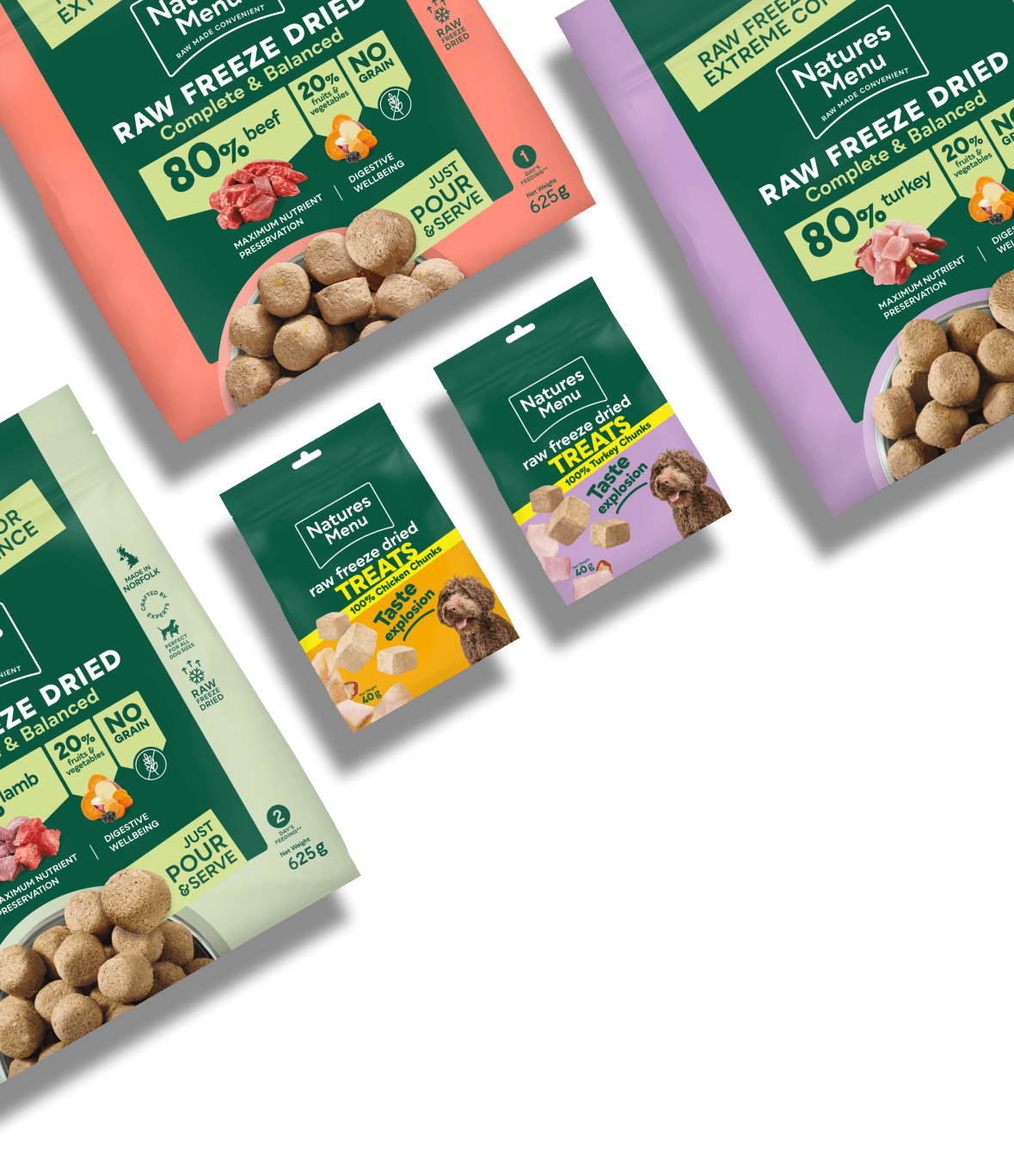 "When Teddy came to live with us, he was overweight from a lack of exercise and a poor diet. Natures Menu raw food has given him a good weight, plenty of energy, a silky coat, and of course easy-to-pick-up poos!"