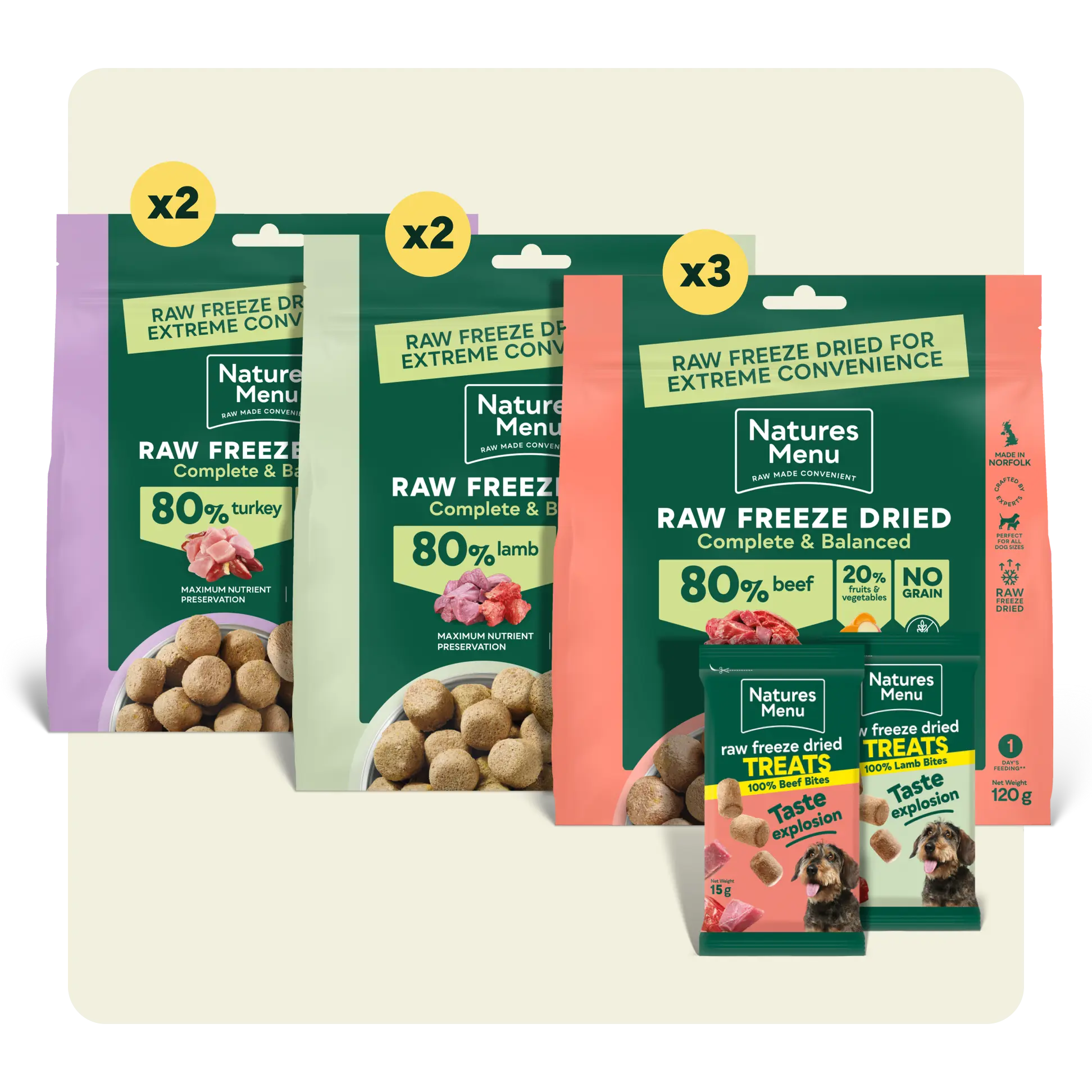 Ideal for first-time raw feeders or smaller dogs Includes 3 freeze-dried raw recipes plus treats Lasts a 10kg dog around 7 days