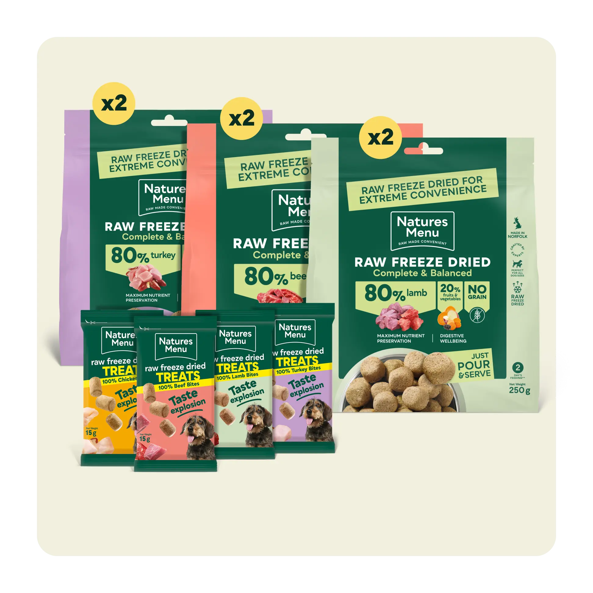 A bigger variety of treats flavours to explore Includes 3 freeze-dried raw recipes plus 4 of our best-loved bites Lasts a 20kg dog around 7 days