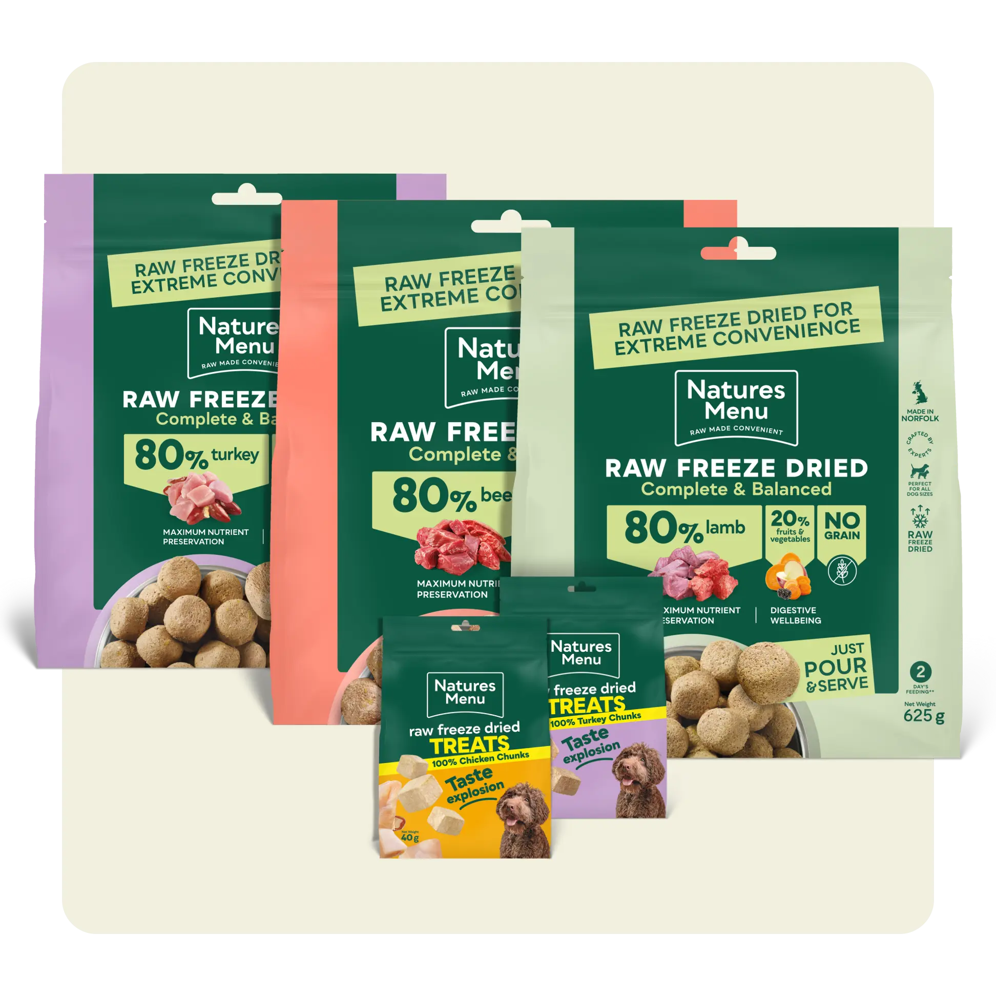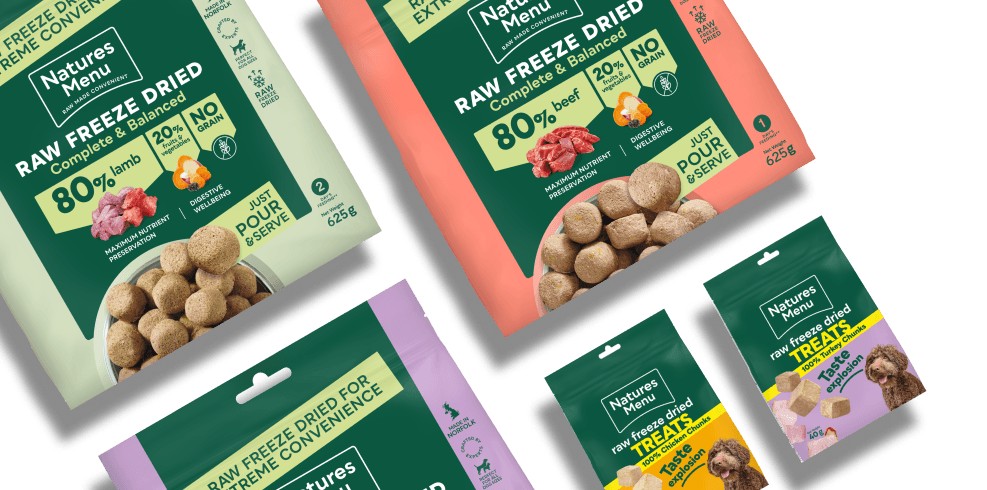 They'll get to try our most-loved freeze dried raw nuggets and tasty, protein-rich treats. They’re cupboard-friendly, complete and balanced, and free from artificial colours, preservatives and fillers. Choose from 3 sizes. The bigger the box, the more mealtimes you’ll cover, and the more flavours your dog can explore.